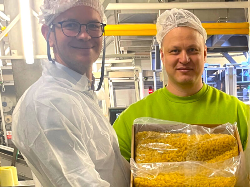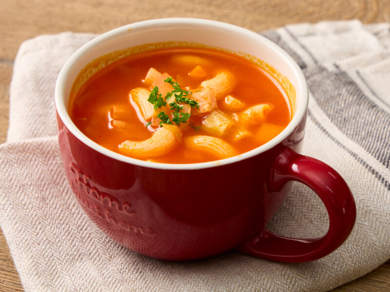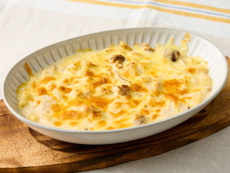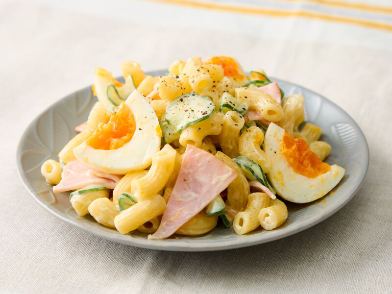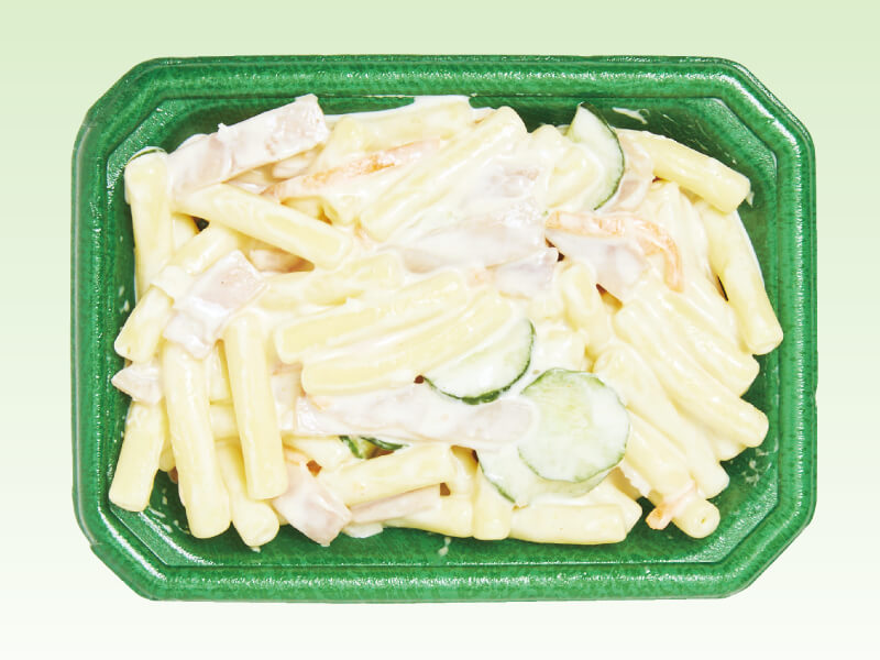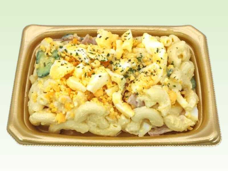風味がよくコシが強く、もちもちとした食感のラトビア産マカロニの特徴を活かしつつ、甘さ強めのマカロニサラダにしか使用していない胡椒を配合したマヨネーズを使用。