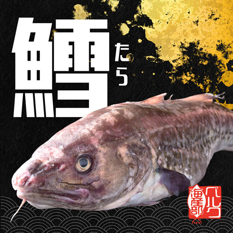 魚偏に【雪】で『鱈』親近感を覚えるポッコリお腹。何でも丸のみする食欲旺盛な魚で、ぱんぱんにお腹が膨れてしまうことも。それくらいたくさん食べるという【たらふく食べる(鱈腹たべる)】の語源です。旬:11月〜2月
