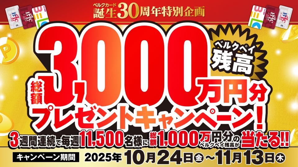【第二弾】ベルクカード誕生30周年特別企画 ベルクペイ残高総額3,000万円分プレゼントキャンペーン