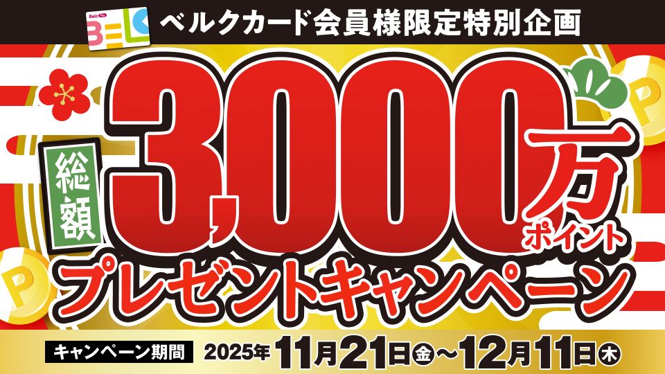 キャンペーン期間中、ベルクカードご提示で税込3,000円ごと(合算可)のお買い物で自動エントリー、抽選にて3週で総額3,000万ポイントを合計6万名様にプレゼントいたします。