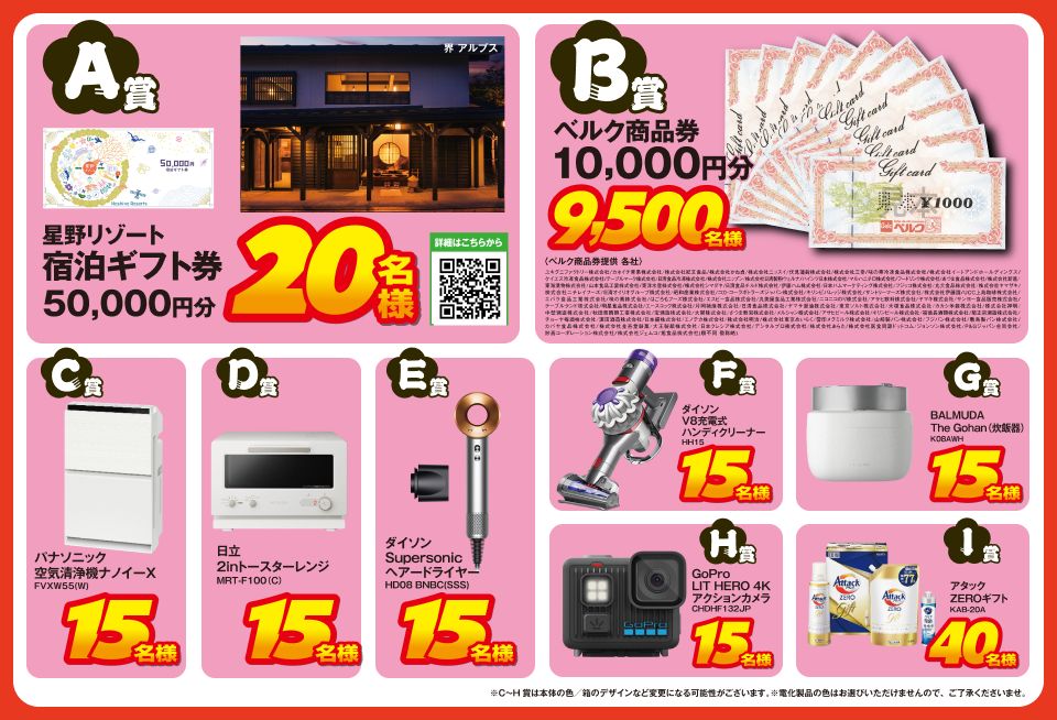 ベルク全店(CLBE店舗除く)にて、期間中のお買い上げ金額が税込3,000円以上のレシート(合算可)を専用応募用紙に貼付、