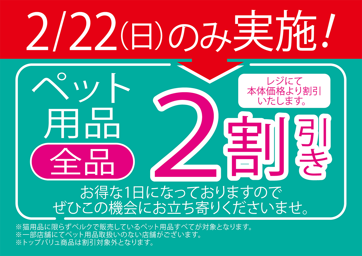 2月22日(日)のみ実施!「ペット用品2割引」セール