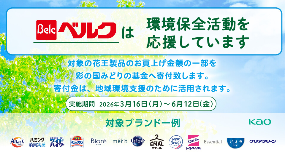 ベルク全店(ベルク一部店舗・CLBE店舗除く)にて、期間中に対象の花王製品のお買い上げ金額の一部を彩の国みどりの基金へ寄付させていただきます。寄付金は、地域環境支援のために活用されます。